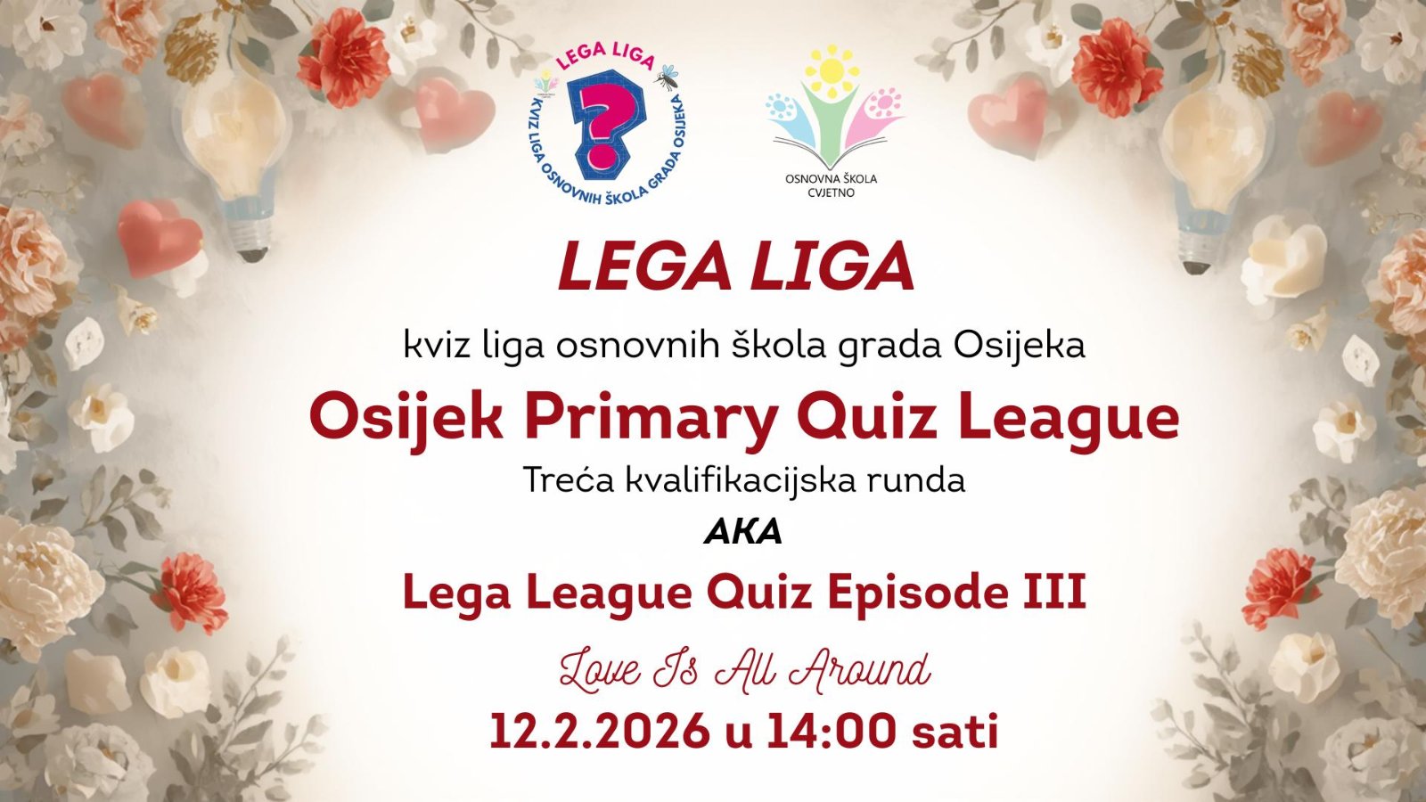 Treća runda našeg Lega liga kviza održat će se u četvrtak 12.2.2026. godine s početkom u 14:00 sati. Tema treće runde biti će LOVE IS ALL AROUND (Valentine’s Day, love idioms, songs, movies, trivia…).. Timovi imaju mogućnost osvojiti 5 dodatnih bodova ako se prigodno “ukrase”, dakle potrebno je odjenuti crvenu vestu, tuniku, majicu ili duksu ,ugl prigodno se „valentinovski“ odjenuti i/ili „ukrasiti“.